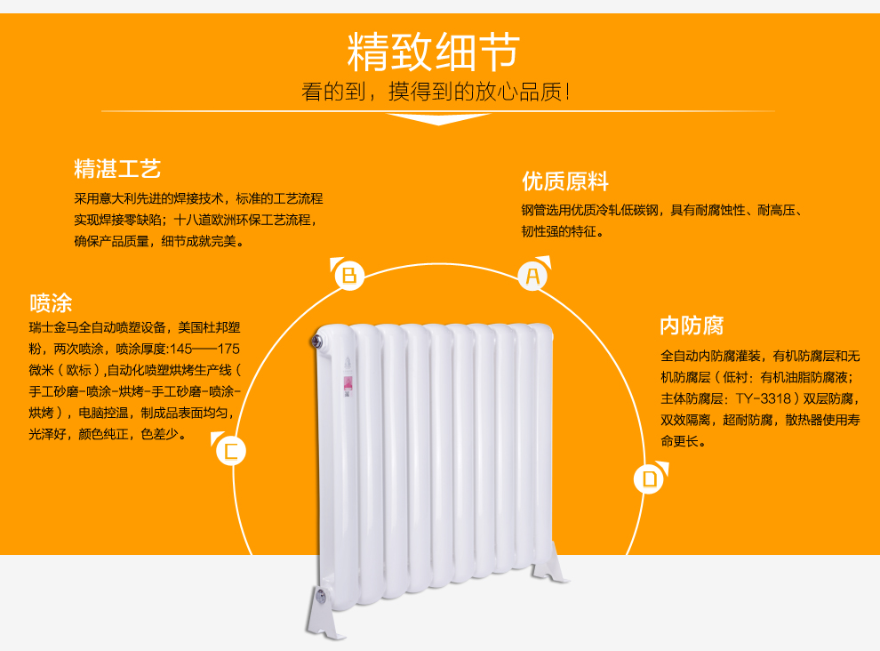 歐洲標準工藝流程:18道工藝成就細節(jié)的完美。奧運工程采用:金旗艦攜手奧運,全力打造精品采暖工程幾百萬家庭見證。綠色、環(huán)保、健康:金旗艦采暖專家,給您和家人360度溫暖呵護。